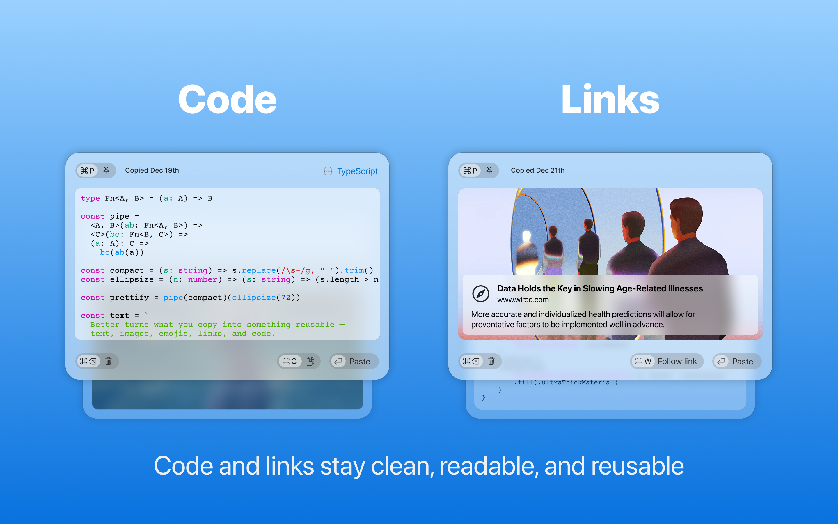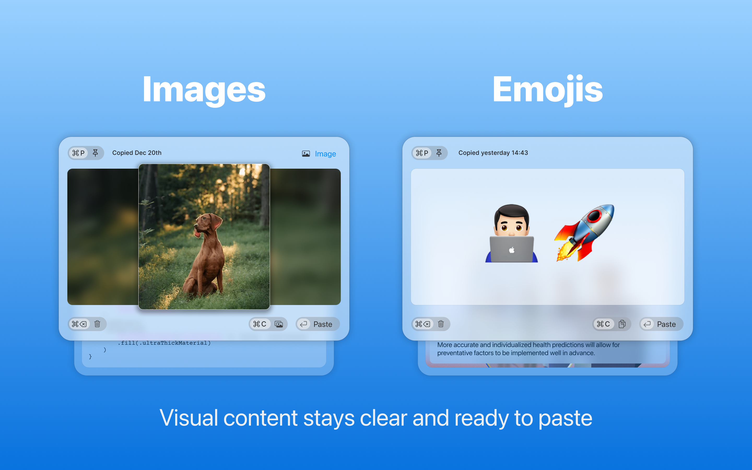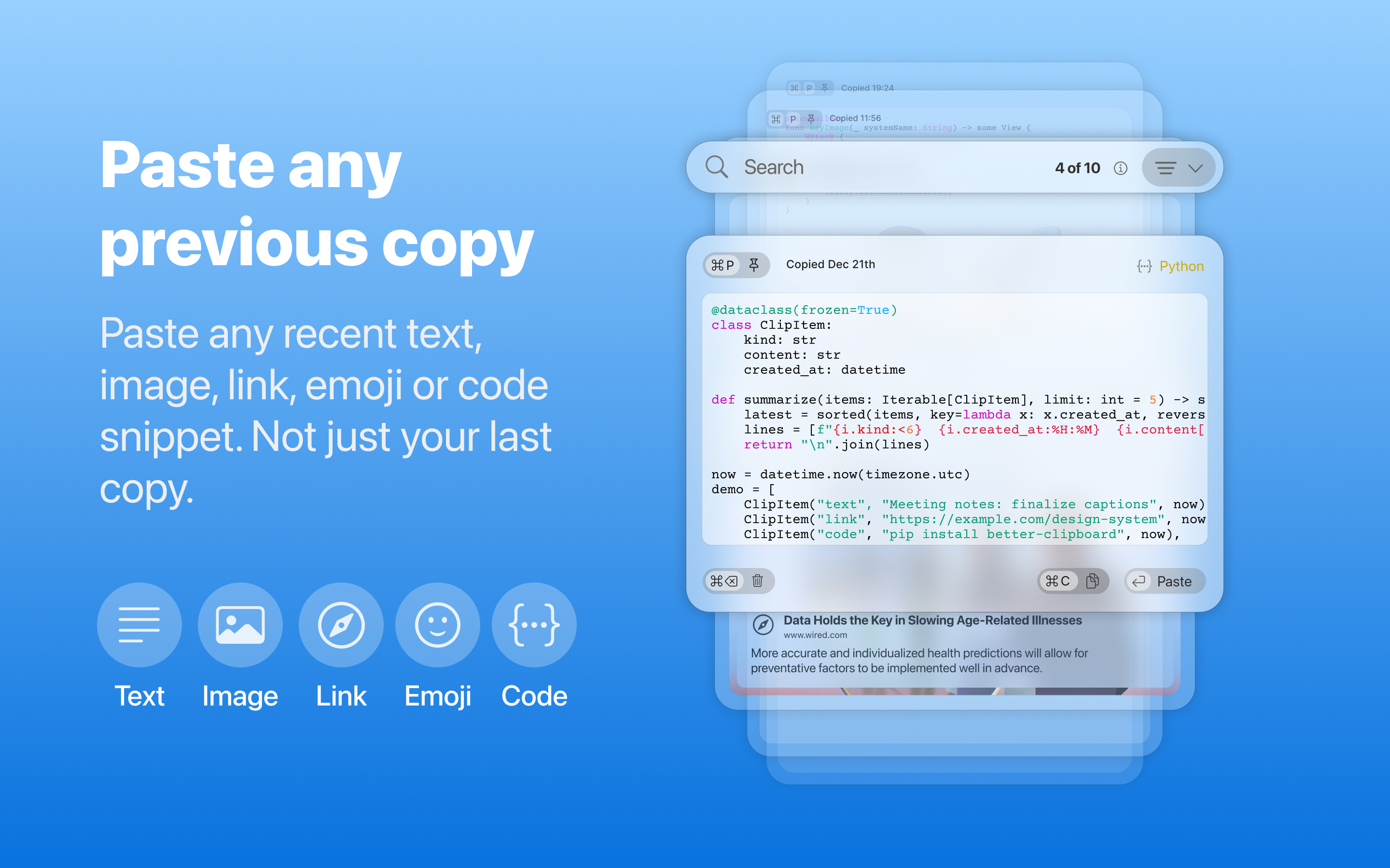 Better Clipboard is a lightweight clipboard app designed for daily macOS workflows. Unlike basic clipboard tools, Better Clipboard shows your history as animated cards instead of plain lists, making it faster to scan and easier to use. Instantly paste text, emojis, images, and programming code you copied earlier without re-copying or switching apps.