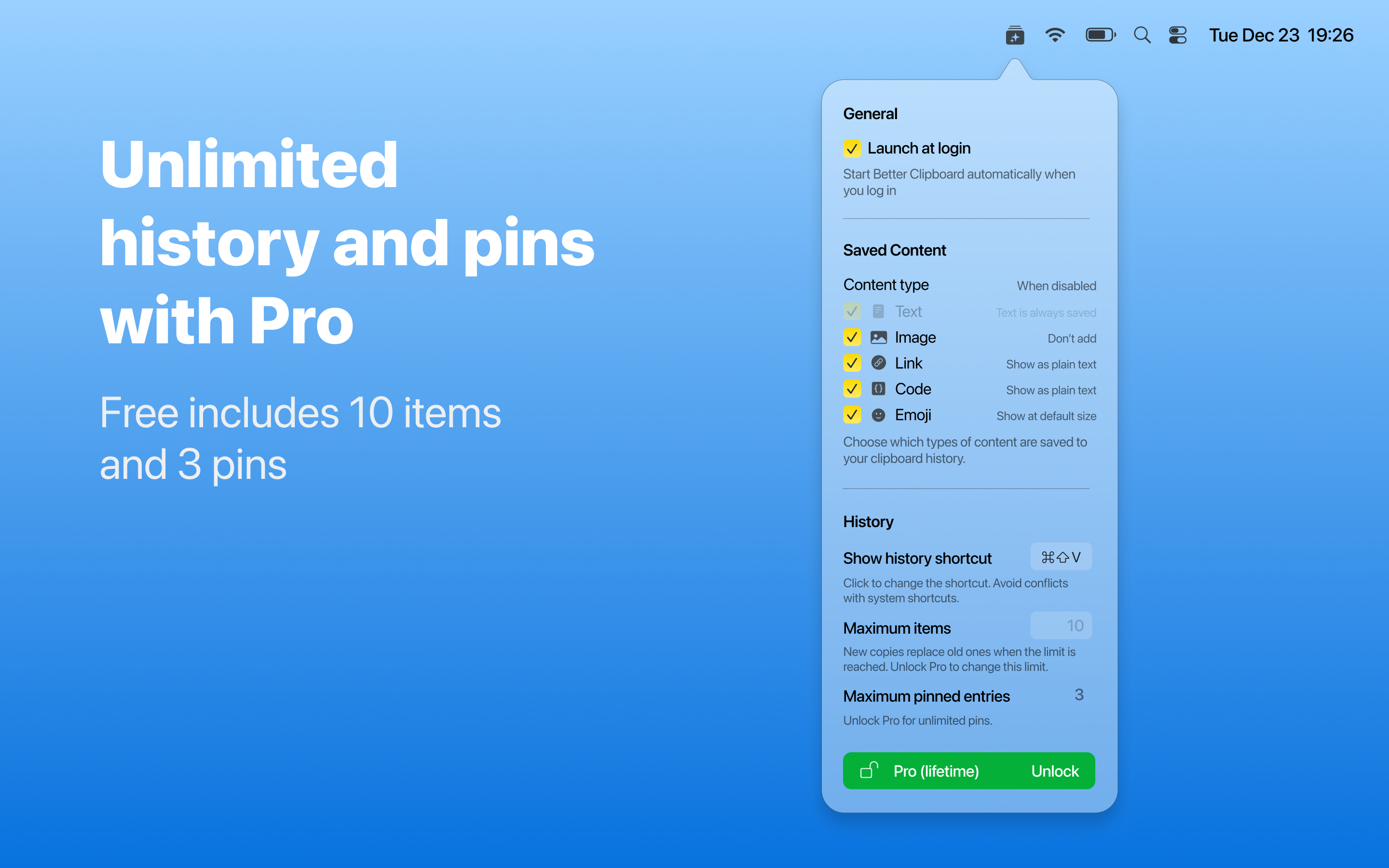 The free version stores up to 10 clipboard entries and allows up to 3 pinned items. Unlock Better Clipboard Pro for unlimited history and unlimited pins.